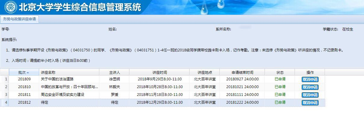 根据《北京大学思想政治课教学管理办法》(2018年6月修订)关于《形势与政策》的选课规定,凡按照院系教学计划选修马克思主义学院开设的《形势与政策》课程的2018级新生,必须在大一通过选课系统选课分班,并自选课起至大三结束前,必须选修至少四次讲座,以刷卡考勤等标准评估成绩。