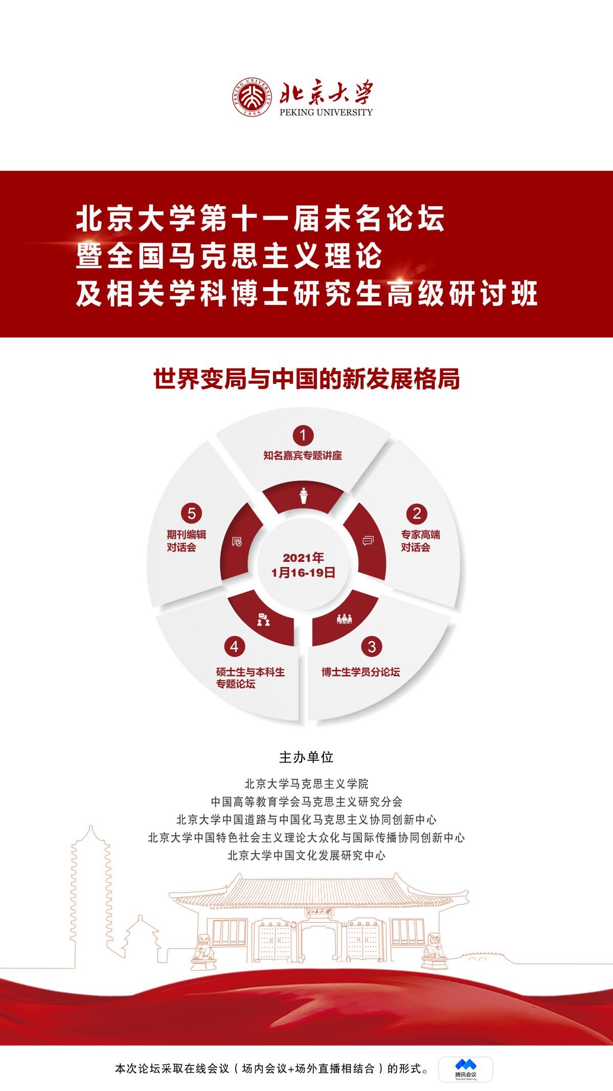 北京大学第十一届未名论坛暨全国马克思主义理论及相关学科博士研究生高级研讨班拟于2021年1月16-19日隆重召开,本届论坛主题是“世界变局与中国的新发展格局”。研讨班将邀请国内著名专家授课、讲解,组织多种形式的论坛、沙龙、演讲。论坛以博士生为主,并设有硕士生和本科生的专题论坛。诚邀全国马克思主义理论学科及经济学、政治学、历史学、社会学、哲学等相关学科博士研究生“云”相聚于百廿燕园,共同审视世界百年未有之大变局,共话中国发展新阶段、新格局、新征程,共商、共建、共享具有中国气派的21世纪马克思主义理论。