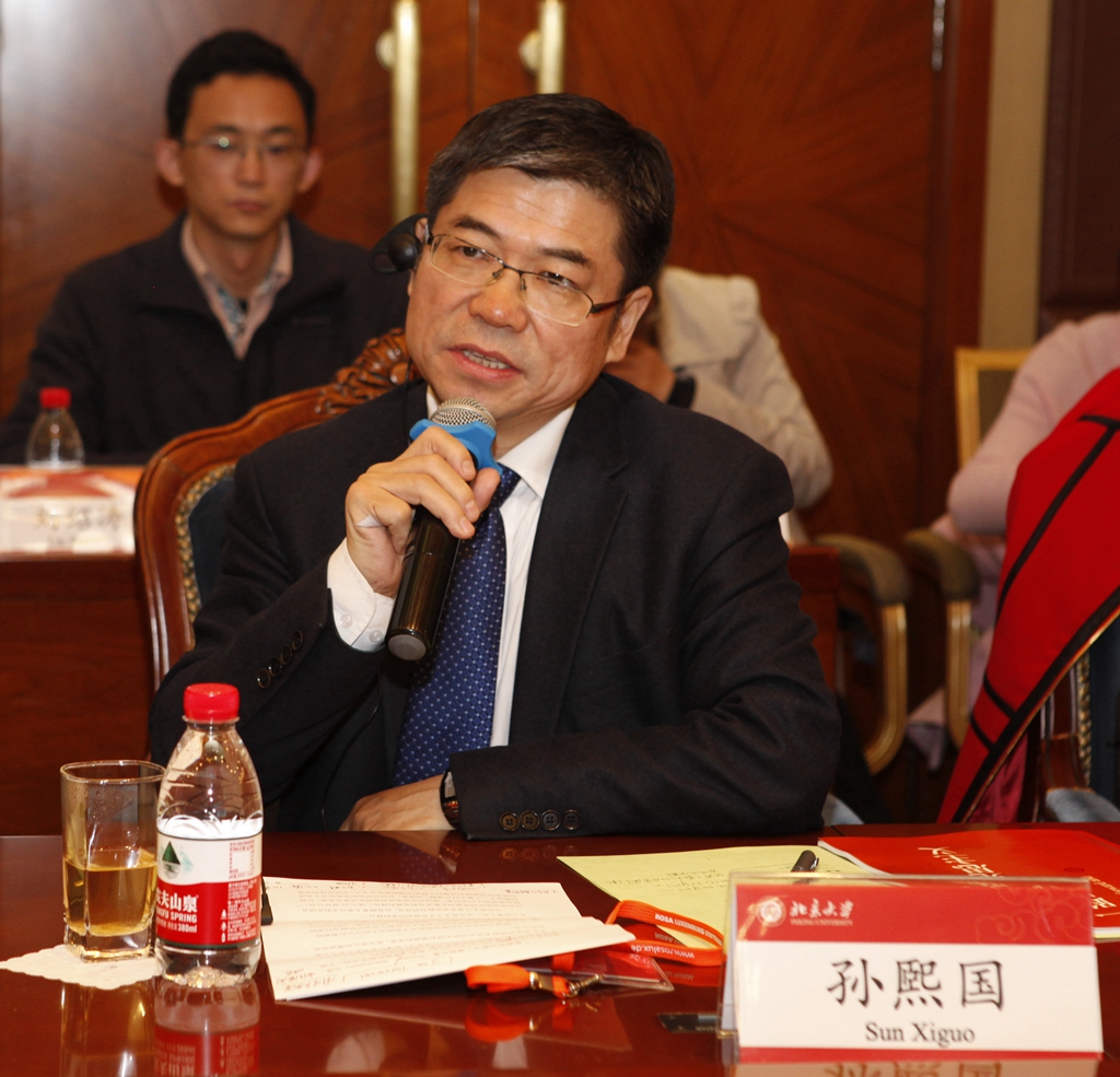 在大会主题发言和自由讨论阶段,与会中德学者围绕不同主题进行了探讨和交流。第一组主题发言由北京大学马克思主义学院孙代尧教授主持,德国罗莎·卢森堡基金会埃尔哈•克罗姆教授与北京大学马克思主义学院郇庆治教授做了主题发言。埃尔哈•克罗姆教授主要讨论了马克思“资本”中的世界市场问题,他指出马克思在《资本论》中就已经有世界体系思想的基础。郇庆治教授则对布兰德批判性政治生态学理论进行了述评,并指出“绿色增长”、“绿色资本主义”等话题,是近年来国际学术界广泛讨论的重大议题。第二组主题发言由罗莎·卢森堡基金会埃尔哈•克罗姆教授主持,罗莎•卢森堡基金会米歇尔•布里教授对西方学术界过去将“资本”视作“未来科学”的思想进行了批判,指出应当从实际的观点出发来重新审视资本主义。武汉大学哲学学院何萍教授分析了阿多诺与马克思的批判的历史哲学传统,她认为把阿多尔诺哲学排除在马克思主义哲学阵营之外,而归到后现代主义中去,这种做法“论据不足”。第三组主题发言由北京大学马克思主义学院程美东教授主持,德国马尔堡大学政治学院弗兰克•徳普教授就21世纪资本主义的一些新矛盾发表了看法,并认为马克思和恩格斯的著作仍然给左翼进步力量一如既往地提供了重要的认识观点。华中科技大学人文学院王晓升教授从历史唯物主义的视角审视了霍耐特的物化分析,复旦大学哲学学院王凤才教授则阐释了“批判的妥协理论”构想。