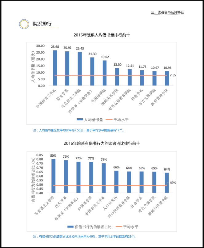 不经一番寒霜苦、哪得梅花扑鼻香。正如习近平总书记所说,“对马克思主义的学习和研究,不能采取浅尝辄止、蜻蜓点水的态度。” 以研读马克思主义经典文献为核心的中期考核为同学们打下了扎实的理论基础,使他们的学术研究之路有了一个良好的起点。2014级博士生黄斐,在博士期间获得国家奖学金,到英国剑桥大学留学一年,毕业论文被评为北京大学优秀博士论文,最终到中国人民大学国际关系学院任教。她回忆起中期考核,无限感激地说道:“学院将马克思主义经典文献作为中期考核的主要内容,并由老师们制定了阅读书目名单,这使我们在博一和博二阶段得以有针对性地阅读马克思主义经典文献,养成了良好的学习和研究习惯,打下了较为扎实的专业理论基础。对我个人而言,问题意识的养成、研究方向的选择、学术信仰的确立都得益于此。”2014级博士生金梦和陈丹,都曾到哈佛大学留学,毕业后将分别去北京师范大学和浙江大学任教。她们学术生涯的基础,也都是准备中期考核过程中打下的原著基础。正是由于学院上下对牢固掌握经典、强化学科学术性的不懈努力,北京大学马克思主义学院的学术空气日渐浓厚,影响力和吸引力日益增强。在北京大学图书馆2016年发布的北京大学阅读报告中,马克思主义学院有借书行为的读者占比为80%,排名全校各院系第1;人均借书量为25.43本,略少于中文系和历史系,排名全校第3。2017年马克思主义学院有借书行为的读者占比上升到95%,继续排名全校第1;人均借书量增长为27.95本,排名全校第1。(见图1、图2)。北京大学马克思主义学院也成为越来越多优秀学子进一步深造的首选。2017级马克思主义基本原理专业硕士生王绯璠本科毕业于北京大学元培学院中国语言文学专业,成绩优异的他没有选择保送中文系,而是来到了马克思主义学院深造。即将入学的2018级硕士金艺铭,本科毕业于北京大学政府管理学院。她保研时也没有选择自己本科的学院,而是选择了马克思主义学院的思想政治教育专业。近年还有大批985大学各类专业的第一名申请到北京大学马克思主义学院深造。学院学术风气的浓厚与生源质量的跃升相得益彰,定会进一步提高北京大学马克思主义学院的影响力。