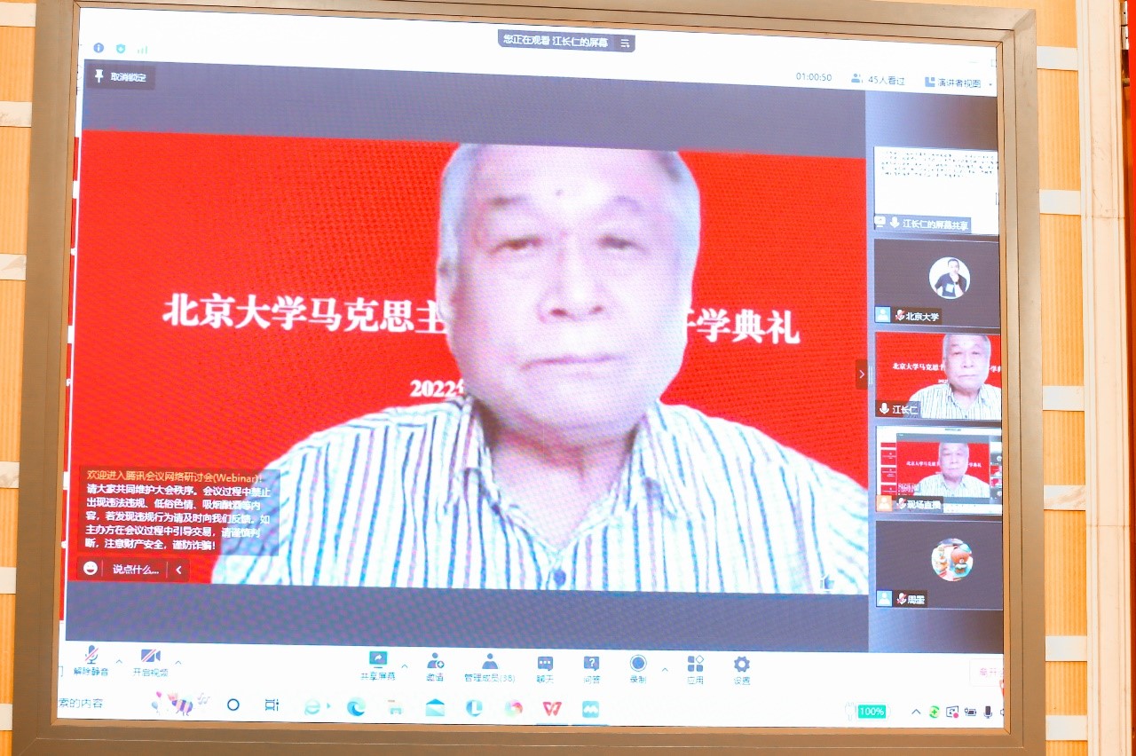 典礼在庄严的国歌声中拉开序幕。马克思主义学院荣休教师代表江长仁教授在线上致辞。他以“多读书、读好书,才有底气”为主题,勉励同学们在新的起点上自律自强,不懈奋斗。他认为,要增强做中国人的志气、骨气、底气,对于青年学生来说,底气就是本领、知识,有底气的人是有能力、贡献、作为、知识的人。获得知识,必须多读书,读好书。通过讲述青年毛泽东和青年习近平的读书故事,他建议同学们读原著、悟原理,原原本本学习和研读经典著作。同时,坚持阅读与思考相统一,学会独立思考,学有所悟。最后,江老师勉励同学们树立远大理想,勇担国家富强、民族复兴重任,为中华民族屹立于世界民族之林而奋斗。