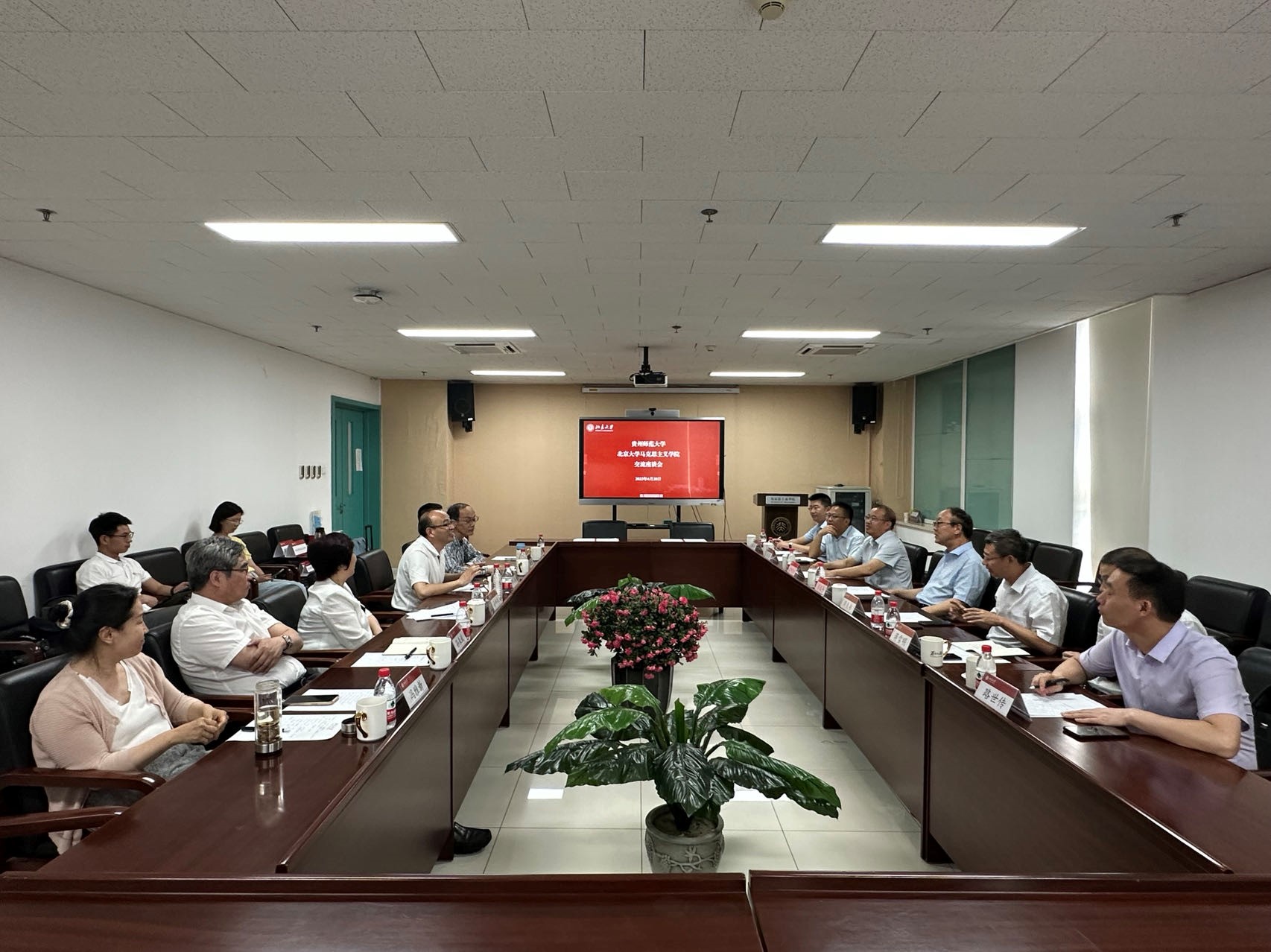 6月28日下午,贵州师范大学党委书记肖远平、副校长欧阳恩良、副校长周良书、组织部部长蒋雪明、校办公室主任杨泉、马克思主义学院党委书记路世传等一行访问我院并进行调研交流,北京大学马克思主义学院院长仰海峰、党委书记孙蚌珠、党委副书记冯雅新、副院长刘军、学术委员会主任孙代尧、教师代表孙来斌与对方在学院301会议室交流座谈。