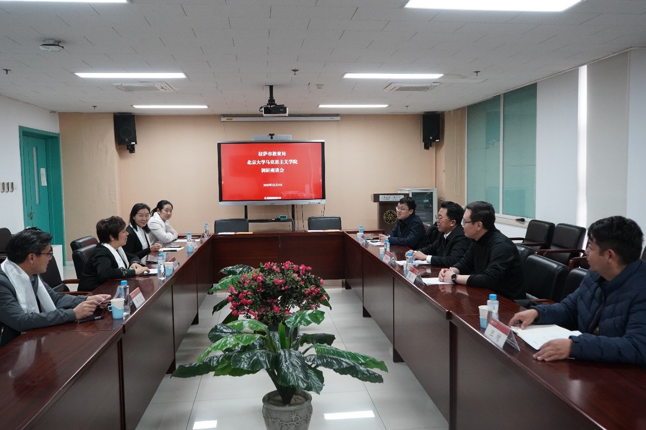 12月4日下午,拉萨市教育局党组书记樊锋旭、北京援藏指挥部党委委员郭峰、拉萨市教育局党组成员周晓宇、拉萨市教育局基础教育科科长旦增等一行访问我院并进行调研交流,北京大学马克思主义学院党委书记孙蚌珠、党委副书记冯雅新、党委副书记李石生、行政办公室主任何花与对方在学院301会议室交流座谈。