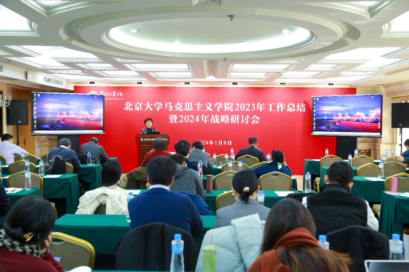 卯兔回眸辞旧岁,辰龙翘首跨新年。2024年1月8日,北京大学马克思主义学院2023年工作总结暨2024年战略研讨会在英杰交流中心第二会议室举行。学院院长仰海峰、党委书记孙蚌珠、学院领导班子成员及全体在岗教职工参加会议。会议由孙蚌珠主持。