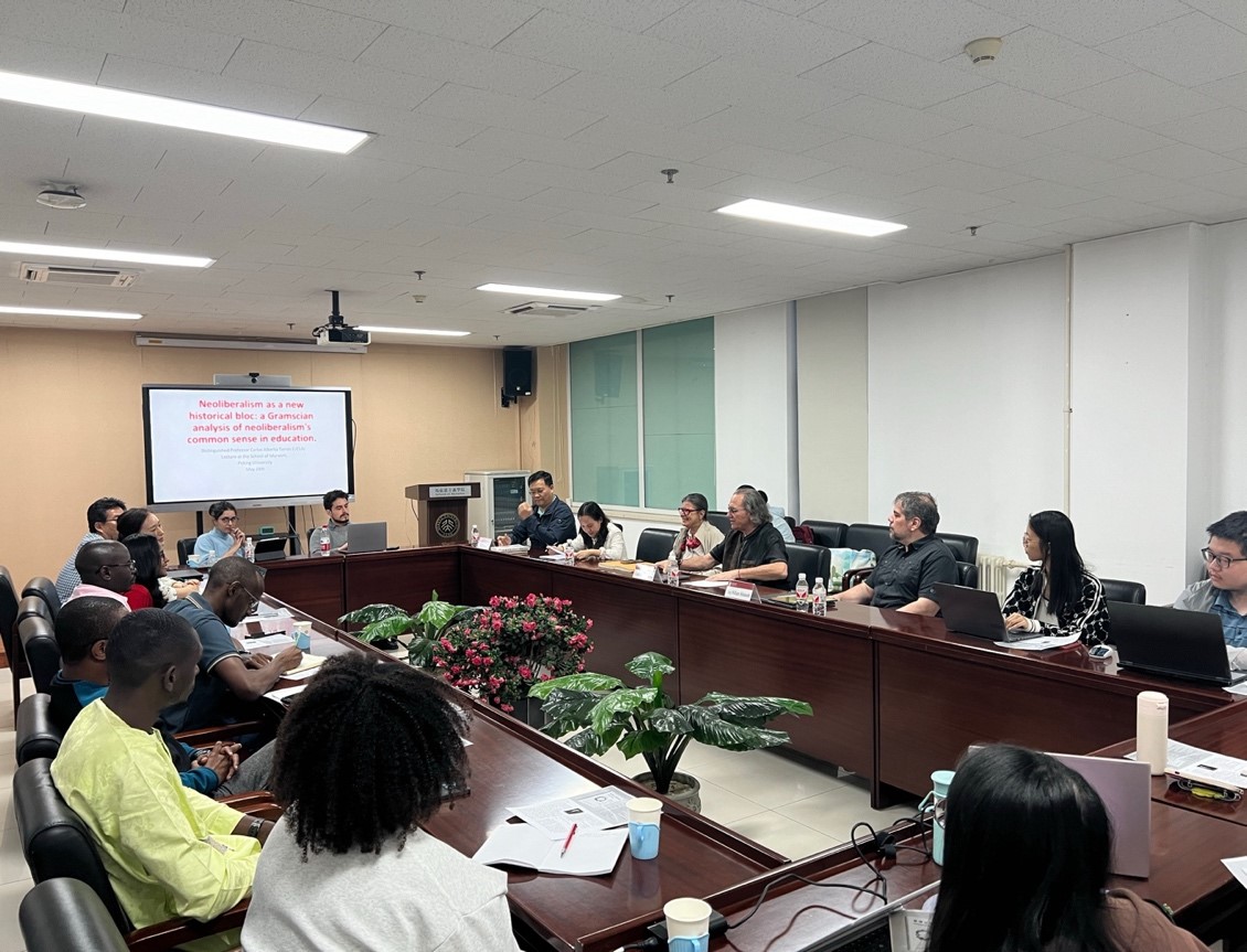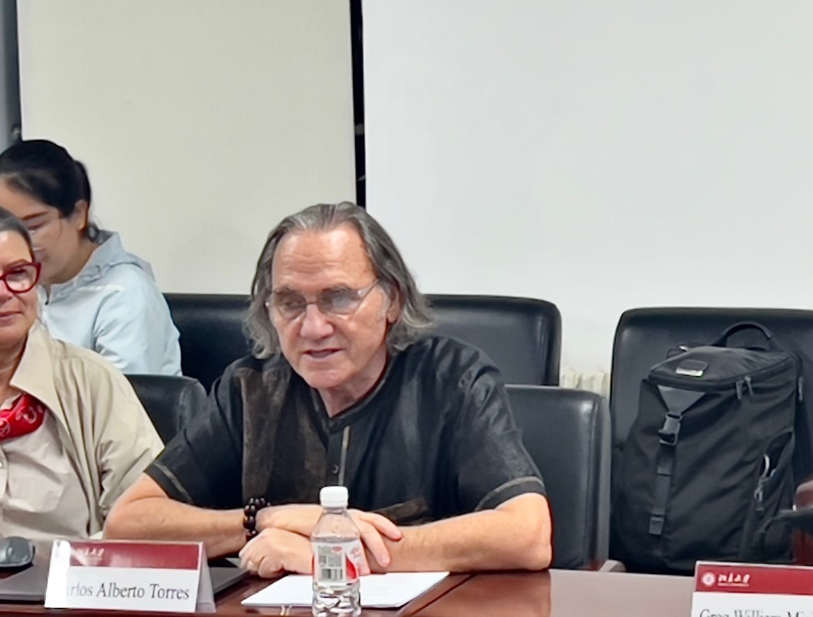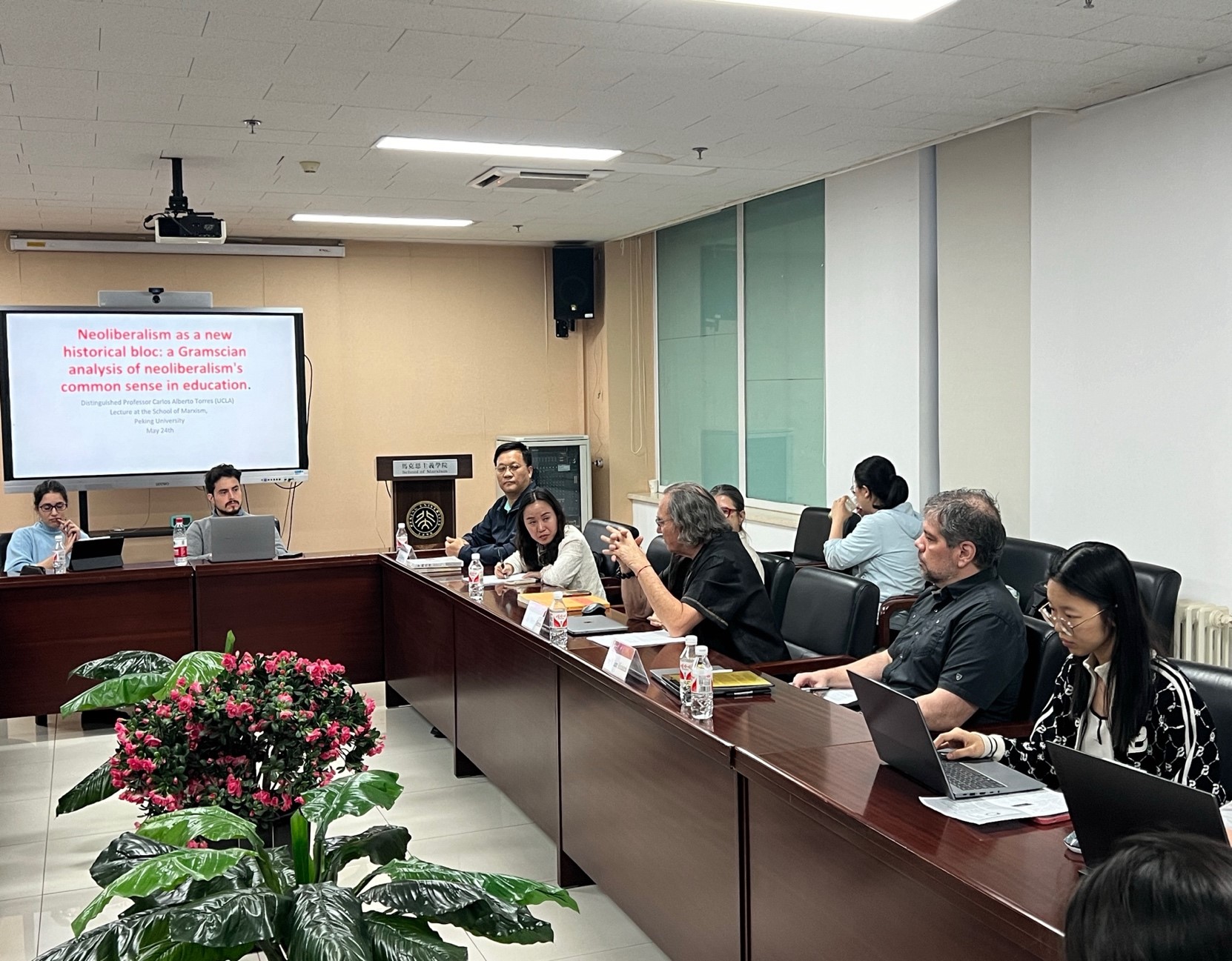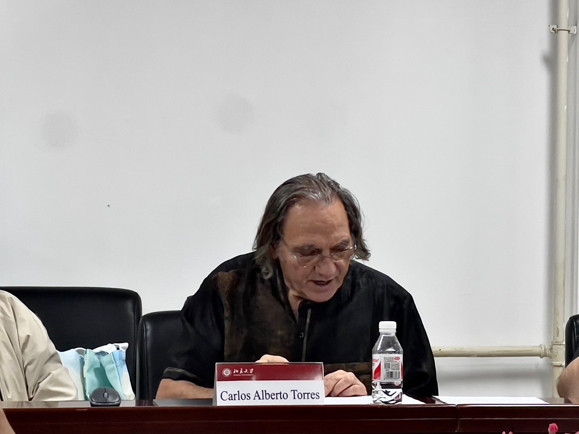 2024年5月24日下午,加州大学洛杉矶分校教育系杰出教授、联合国教科文组织全球学习与全球公民教育主席、加州大学洛杉矶分校保罗·弗莱雷研究所所长兼创始人卡洛斯·A·托里斯(Carlos Alberto Torres)受北京大学马克思主义学院邀请,为学院师生作“作为新历史集团的新自由主义:葛兰西视角下新自由主义教育常识探析”(Neoliberalism as a new historical bloc: a Gramscian analysis of neoliberalism's common sense in education)主题讲座。讲座由北京大学马克思主义学院教授、副院长宇文利主持,北京师范大学教育学部副教授、加州大学洛杉矶分校保罗·弗莱雷研究所副所长格雷格·W·米西亚塞克(Greg William Misiaszek)参与对谈,北京大学马克思主义学院、历史系、社会学系、哲学系、教育学院以及北京师范大学政府管理学院、教育学院的中外师生30余人参与活动。