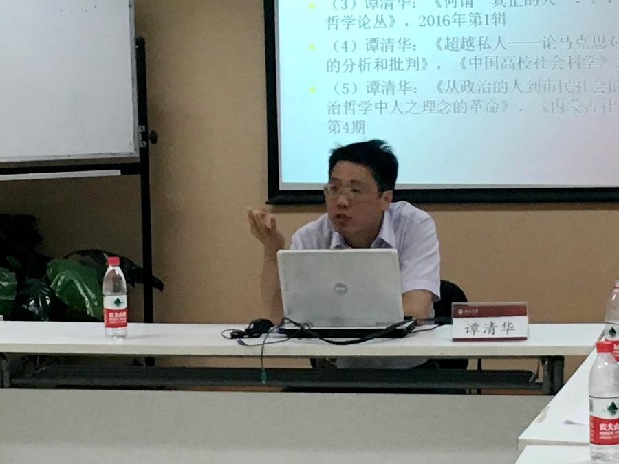谭清华老师以马克思的《论犹太人问题》为阅读文本,从《论犹太人问题》中的“den offentlichen”的翻译问题出发,结合马克思在克罗茨纳赫时期的思想背景,探讨了马克思对黑格尔法哲学的批判和吸收,阐释了他对于马克思关于“私人”和“公人”概念的独到理解,并指出了这一对范畴的现实启示意义。